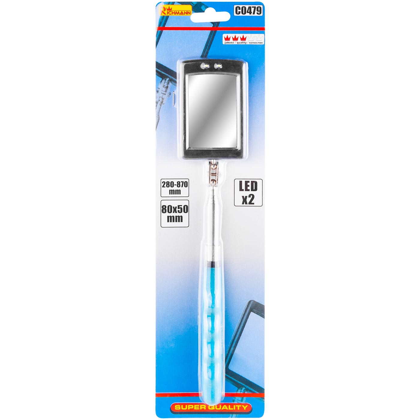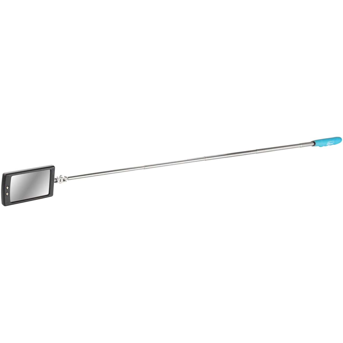 Stačiakampis teleskopinis apžiūrinis veidrodis su LED foniniu apšvietimu, kurio matmenys 80 x 50 mm. Veidrodis teleskopiškai tęsiasi nuo 28 iki 87 cm.