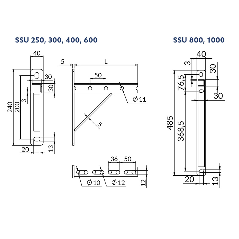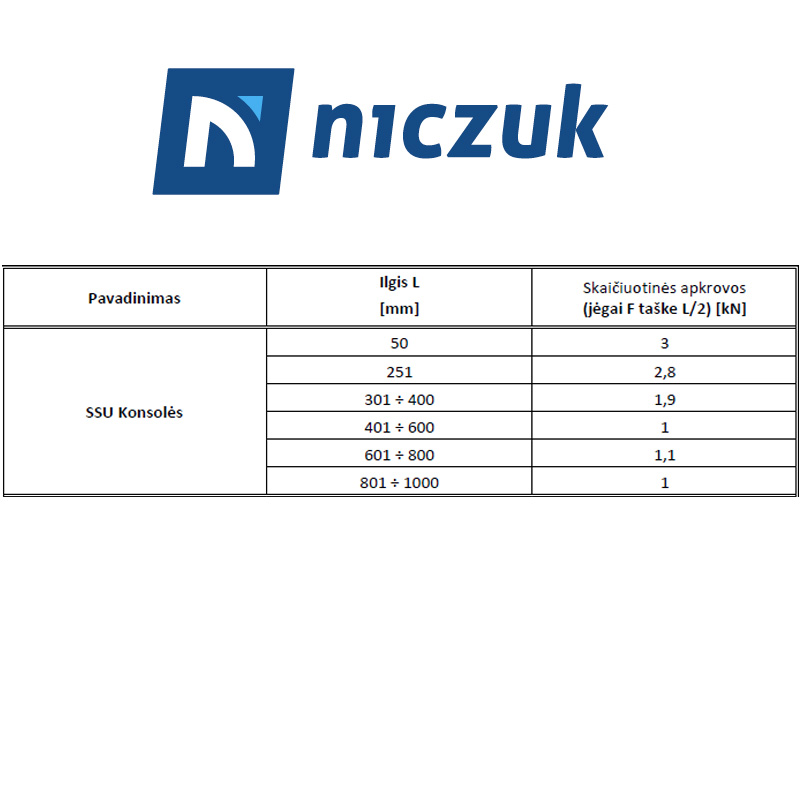 | Gaminys | Ilgis (mm.) | Maksimali apkrova (kg.) | Tvirtinimo plokštelės storis * plotis (mm.) | Tvirtinimo plokštelės aukštis (mm.) |