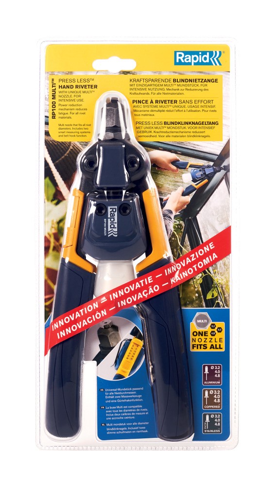 Lengvai naudojamos, galingos ir patvarios kniedijimo replės, tinkamos visų tipų lakštinio metalo darbams ir remontui. Privalumai:• Galios mažinimo technologija ir patogi, ergonomiška rankena leidžia RP100 Multi naudoti ypač dideliuose projektuose, nes galite dirbti ilgiau nepavargdami. • Naudodami unikalų daugiasluoksnį antgalį, galite greitai pakeisti kniedžių dydžius, nekeisdami antgalio - mažiau trukdžių ir optimalus rezultatas dirbant su bet kokiu lakštinio metalo darbu.• Replėse taip pat yra integruotos apkabos, kurios padeda išmatuoti medžiagos, kurią ketinate sujungti, storį, taip pat kniedės skersmenį. • Kniedijimo replės skirtos 3,2–4,8 mm kniedėms, pagamintoms iš visų rūšių medžiagų, gali susidoroti net su kiečiausiomis kniedėmis iš nerūdijančio plieno.