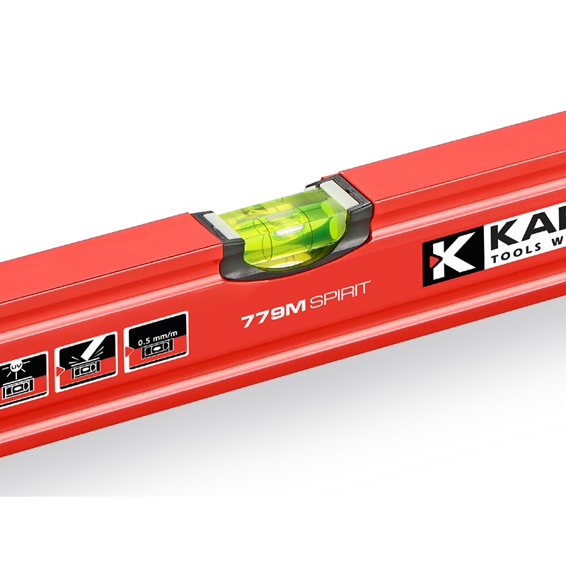 • Itin tikslus magnetinis gulsčiukas. • 2 akrilinės akutės. • Tikslumas: 0,5 mm/m. • Smūgius sugeriantys guminiai antgaliai. • Itin tikslus frezuotas paviršius iki 120 cm.
