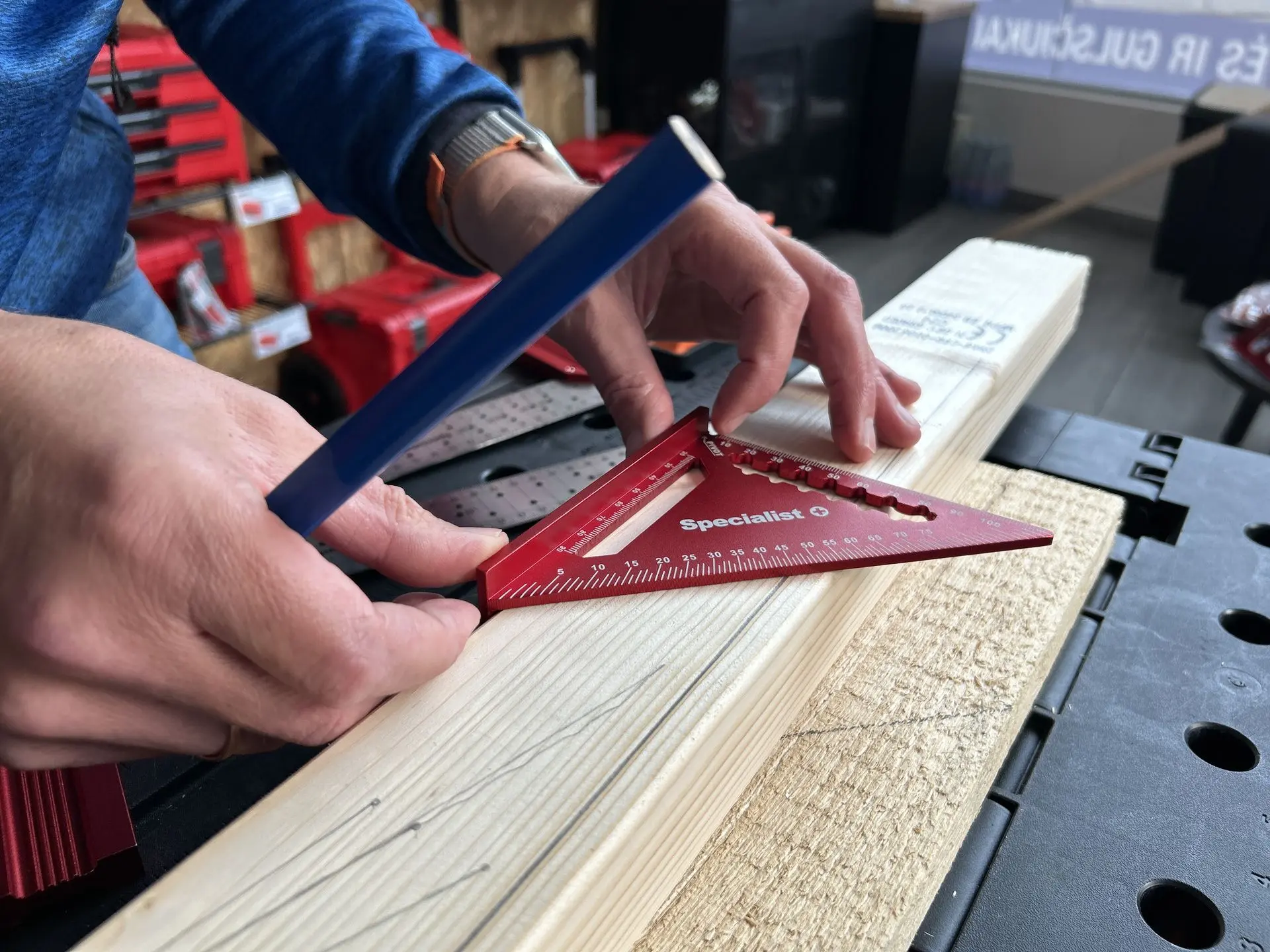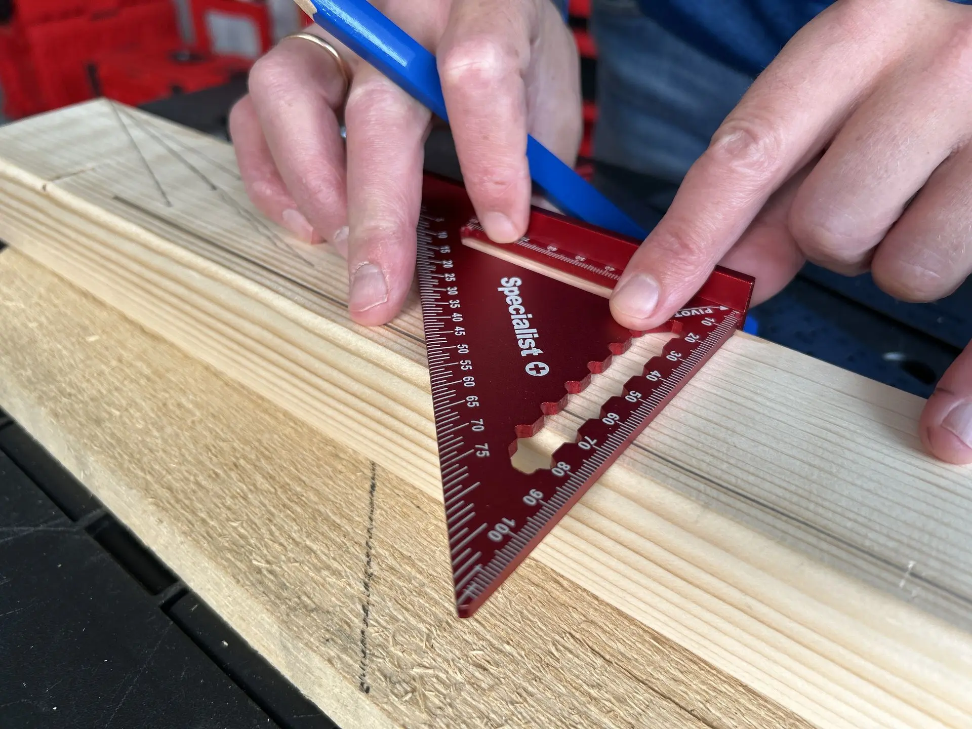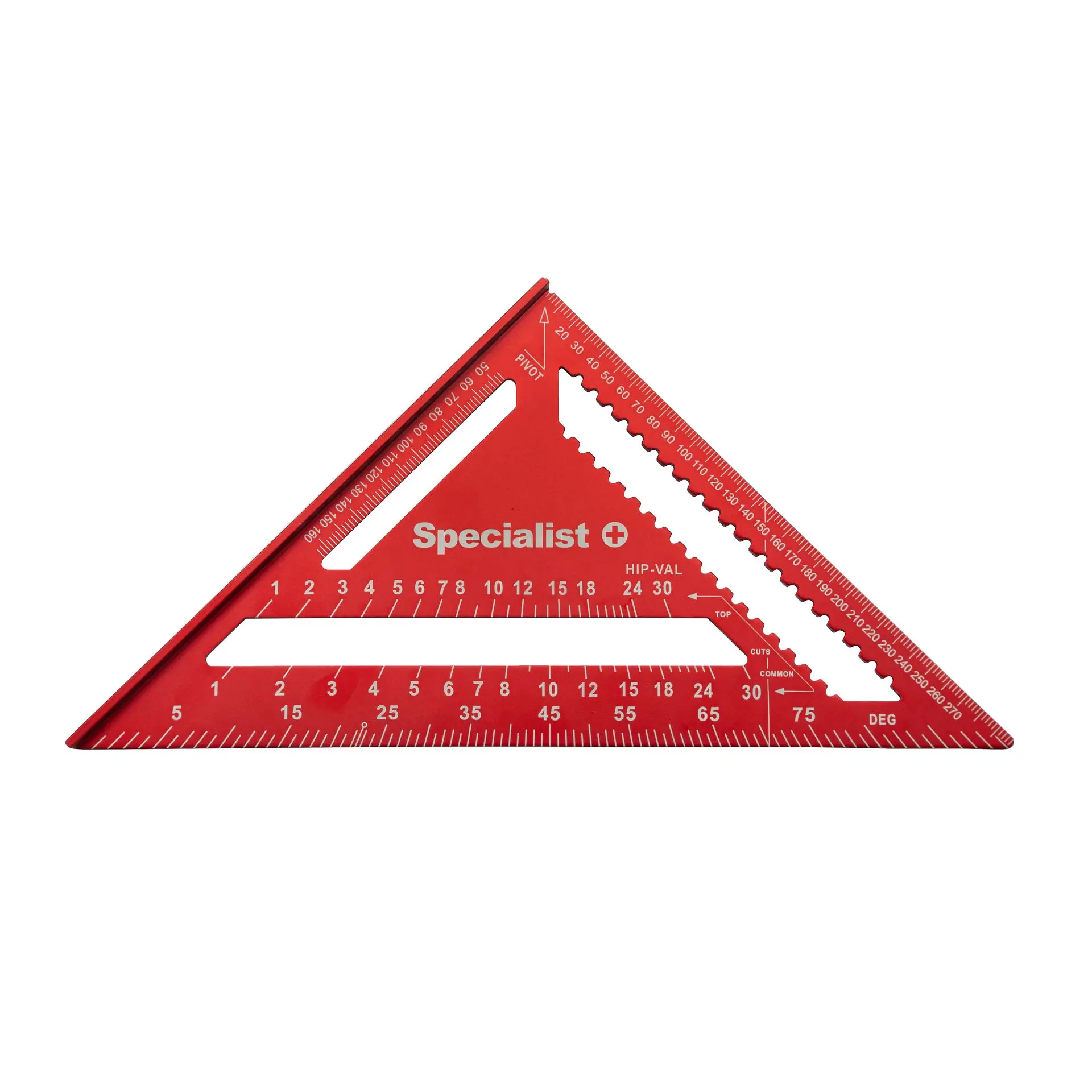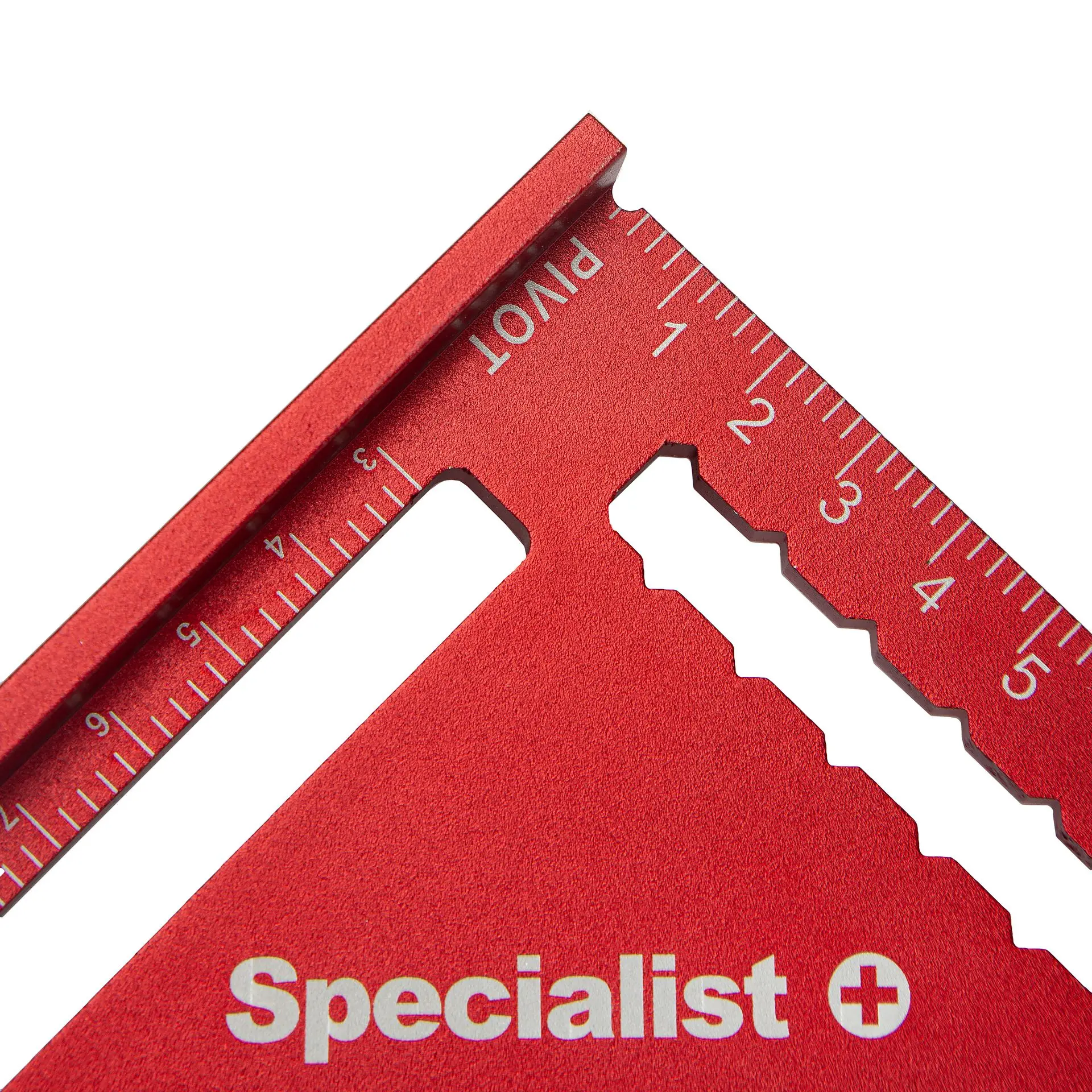 Aukštos kokybės Specialist+ matavimo trikampis, pagamintas iš tvirto anoduoto aliuminio, užtikrinančio ilgaamžiškumą ir atsparumą korozijai. Raudona anoduota spalva pagerina matomumą darbo vietoje, o lazeriu išgraviruota skalė ir skaičiai garantuoja ilgaamžį žymėjimą, kuris nenusitrina net intensyviai naudojant. Naudojama metrinė skalė (mm/cm).