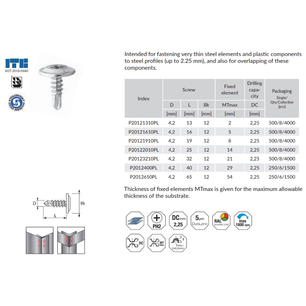 | Indeksas | Varžtas | Fiksuotas elementas | Gręžimo pajėgumas | Pakavimas | ||