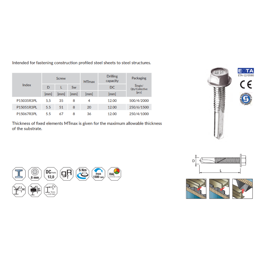 Skirti profiliuotų metalinių lakštų tvirtinimui prie metalinių konstrukcijų. Naudojami stogų ir fasadų montavimo darbuose, kur reikalingas sandarus ir patikimas sujungimas.