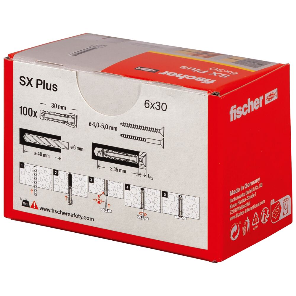 Universalus nailoninis kaištis SX Plus Privalumai: • 4 krypčių išsiplėtimas užtikrina optimalų jėgos perdavimą ir garantuoja aukštą sukibimą kietose ir perforuotose statybinėse medžiagose. • Specialūs tvirtinimo dantukai fiksuoja medsraigtį - nereikia papildomai prilaikyti medsraigčio dirbant prie lubų. • Kištuko kraštas neleidžia nuslysti giliau į gręžimo angą. • Pastebimas priveržimo momentas padeda išvengti per didelio priveržimo. Medsraigčio parinkimas pagal kaištį: • Kaištis ø 4 mm – medsraigčiui ø 2–3 mm. • Kaištis ø 5 mm – medsraigčiui ø 3–4 mm. • Kaištis ø 6 mm – medsraigčiui ø 4–5 mm. • Kaištis ø 8 mm – medsraigčiui ø 4,5–6 mm. • Kaištis ø 10 mm – medsraigčiui ø 6–8 mm. • Kaištis ø 12 mm – medsraigčiui ø 8–10 mm. • Kaištis ø 14 mm – medsraigčiui ø 10–12 mm. • Kaištis ø 16 mm – medsraigčiui ø 12 mm. • Medsraigčio ilgis visada turėtų būti bent truputį ilgesnis nei kaiščio.